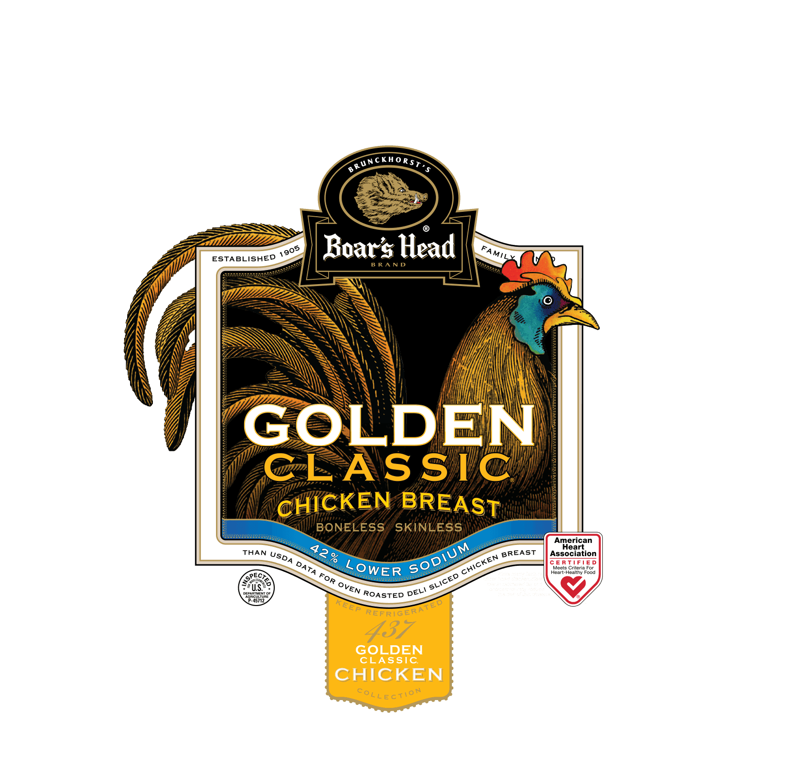 Boar’s Head® Golden Classic® 42% Lower Sodium Oven Roasted Chicken Breast is crafted from high quality hand-selected chicken breasts that are oven roasted and delicately browned for a better for you take on a home-style fried chicken. Certified by the American Heart Association® as a Heart Healthy product, this item delivers a ton of flavor while being 42% lower in sodium*, low in fat, and saturated fat free.
