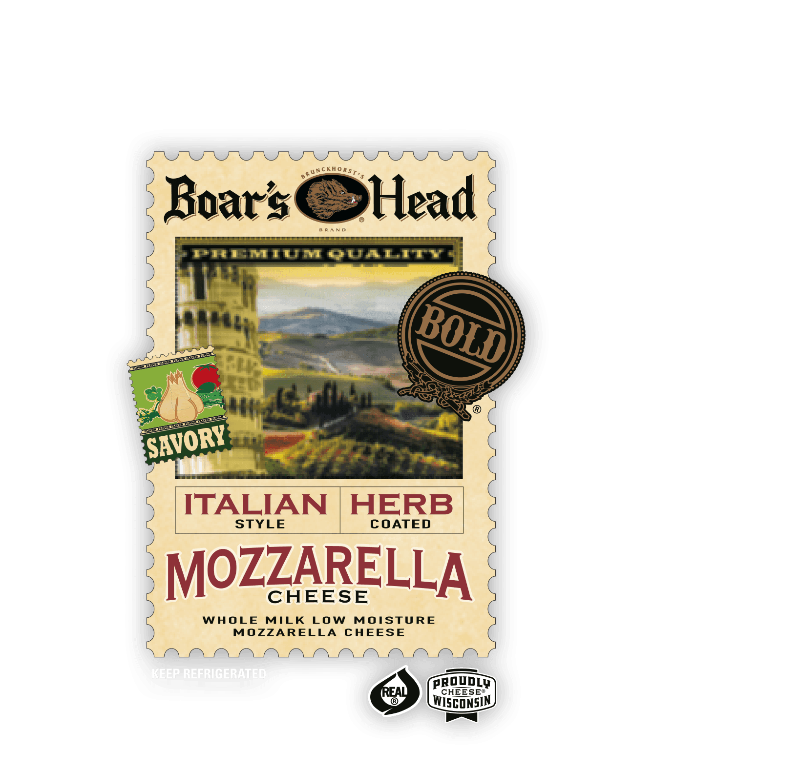 Inspired by the lush Tuscan farms of Italy's heartland, Boar’s Head Bold® Italian Style Herb Coated Mozzarella Cheese is a taste of the Old Country. Creamy whole milk mozzarella is generously coated with an aromatic blend of basil, oregano, rosemary, bell pepper and garlic for a sensory expedition to the Italian countryside.