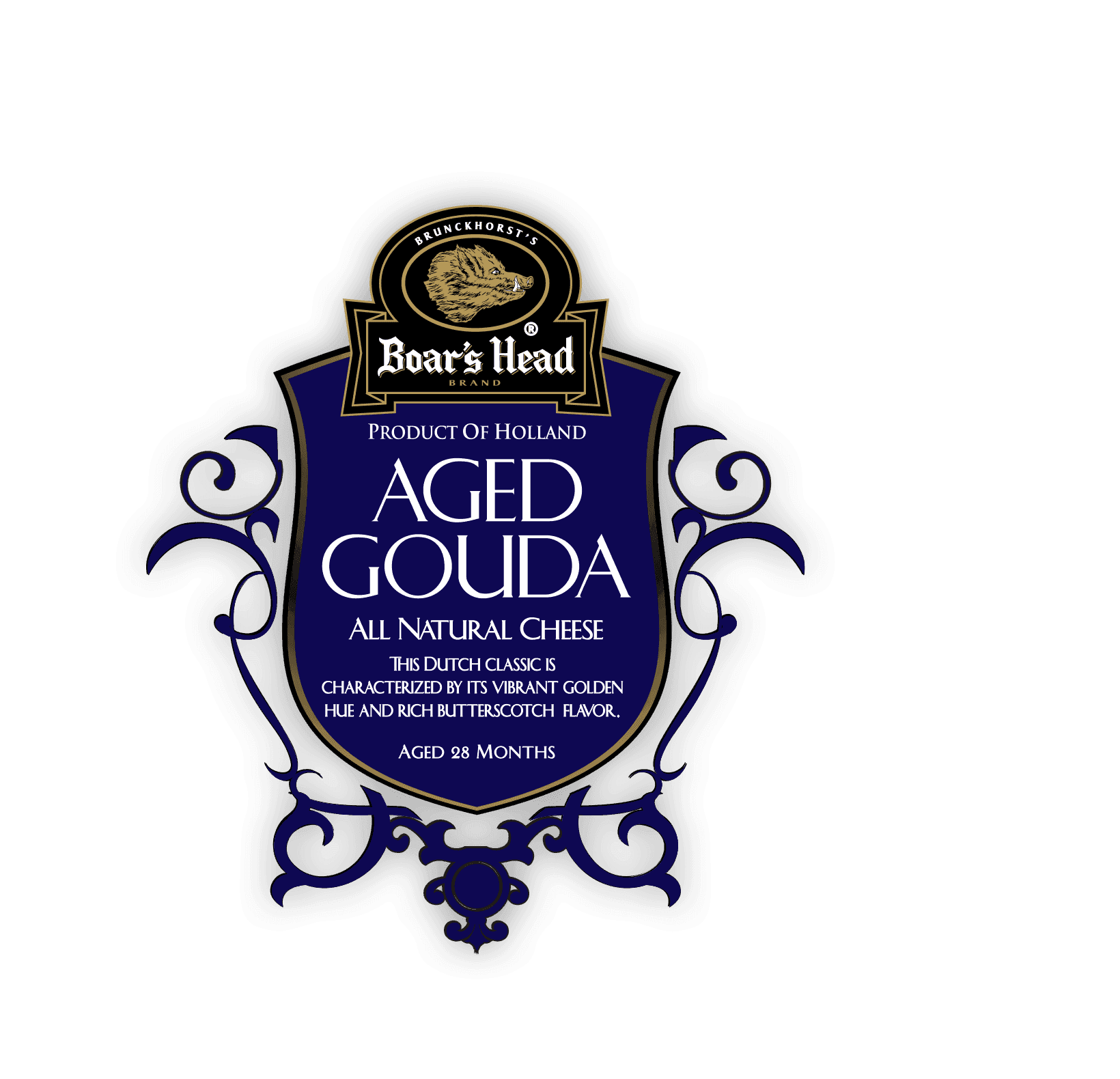 Rich and complex with sweet, salty and sharp notes and a hint of butterscotch, this import from Holland is aged for over 28 months in the traditional Dutch manner for a firm texture and unique taste. Boar's Head® Aged Gouda Cheese has a vibrant golden hue and a distinctly sharp flavor.