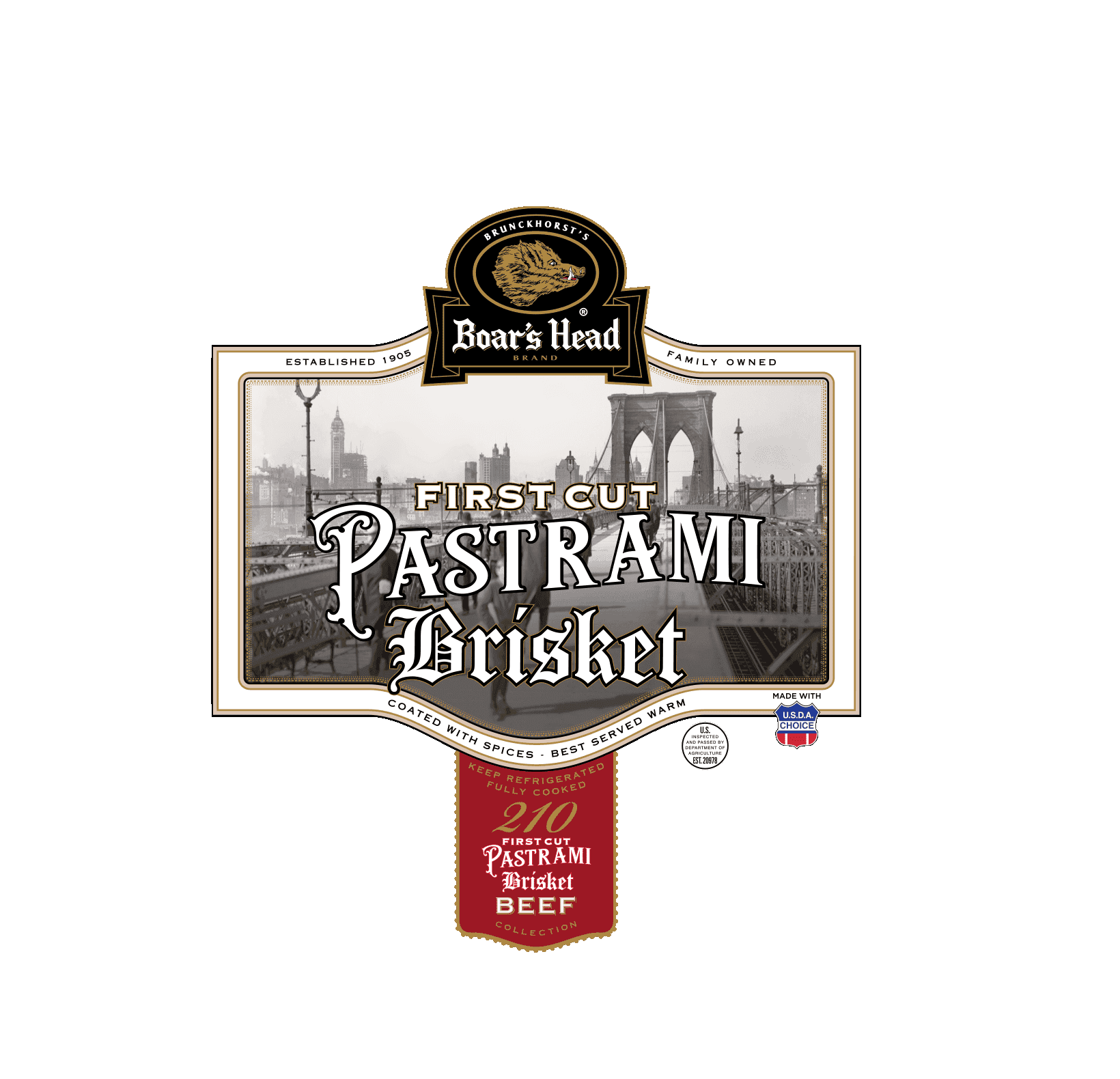 Infused with traditional flavor, this hand-trimmed cut is coated with spices then patiently smoked. Each slice of Boar’s Head® Frist Cut Pastrami Brisket is packed with authentic New York deli flavor.