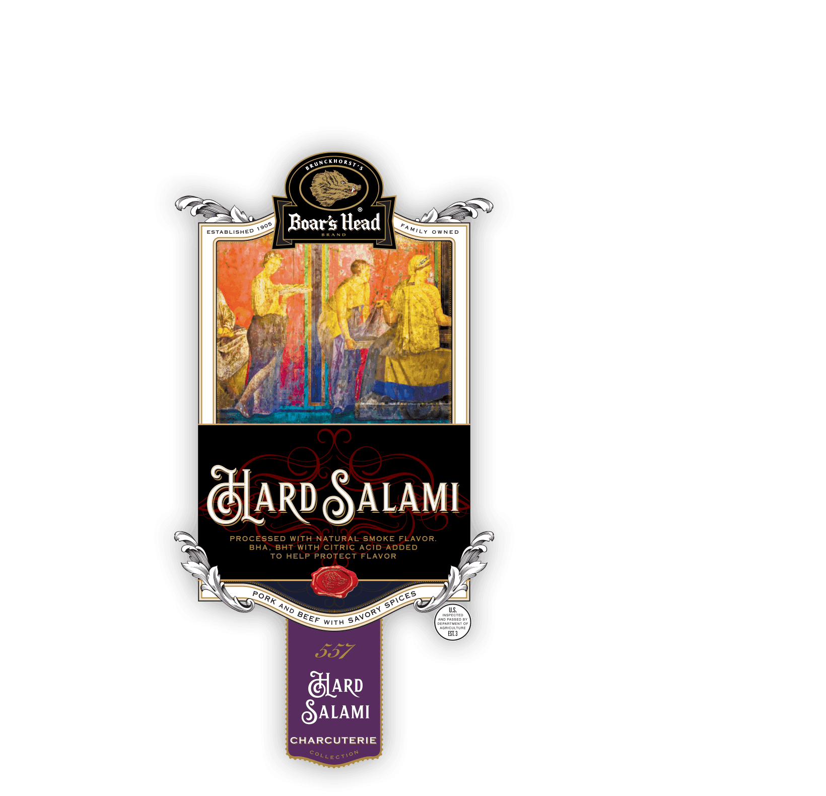 Boar's Head® Hard Salami boasts a lightly smoked flavor and is crafted from a blend of pork beef and savory spices.