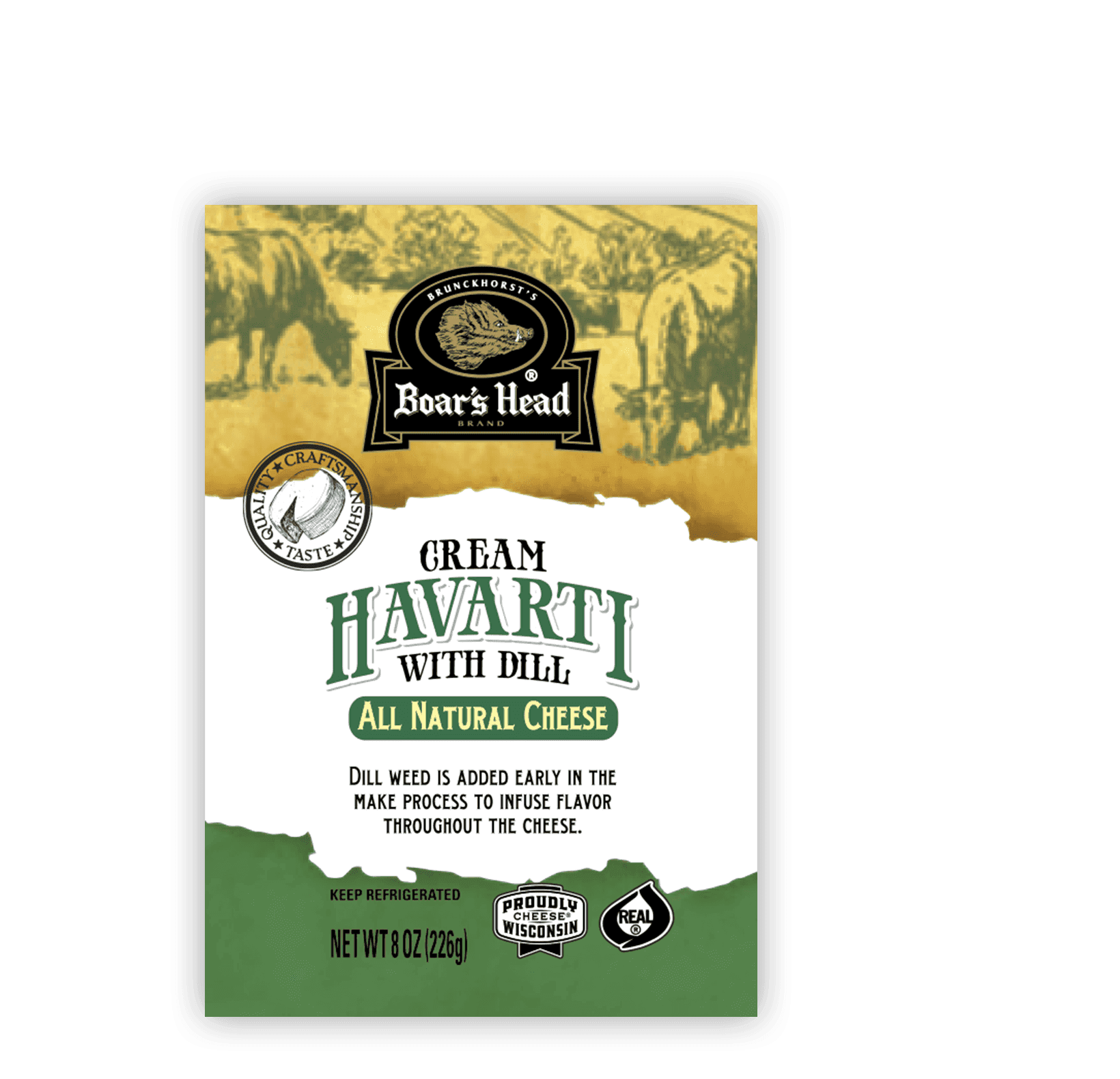 A double crème classic made in the traditional Danish style. Boar’s Head® Cream Havarti with Dill is a Wisconsin-made cheese that has an incredibly creamy texture with a rich buttery taste and the delicate flavor of Dill.